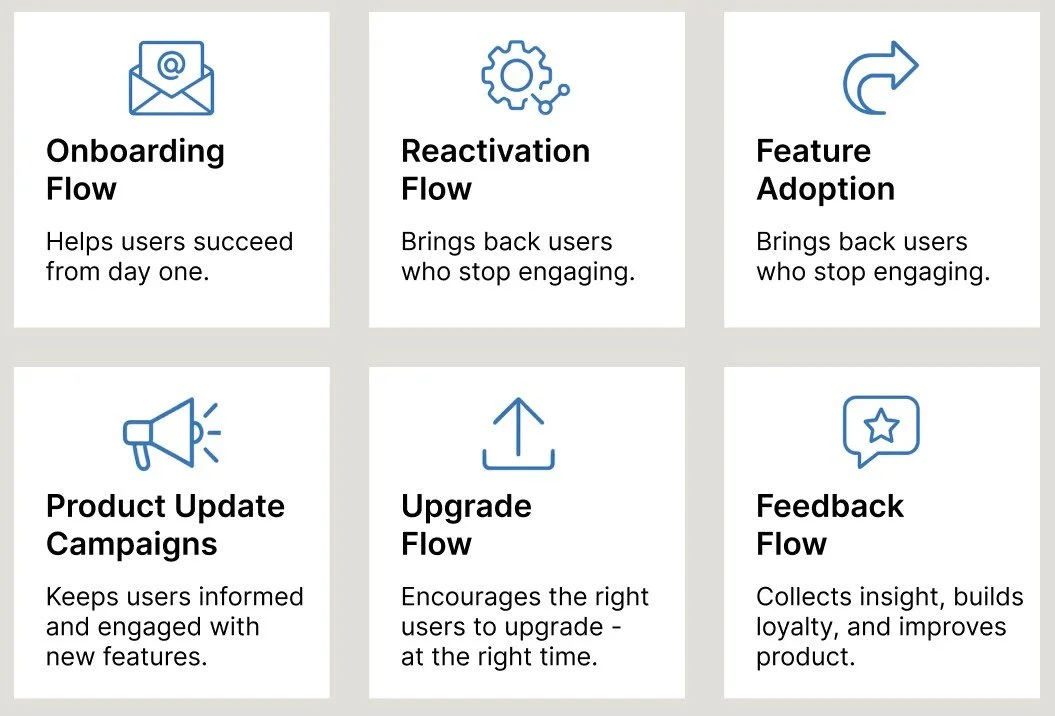 Flows designed around user actions to boost activation, retention, and upgrades.